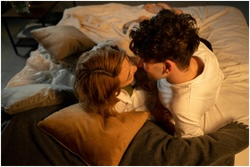 A close-up view of a loving couple lying face to face, sharing an intimate moment on a cozy bed.