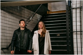 Cheerful couple in casual clothes holding hands and going downstairs in underground passage placed in city in evening time