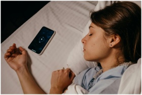 A woman sleeping peacefully with a smartphone on t