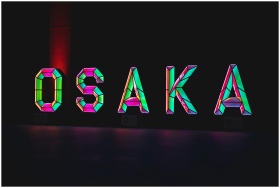 Colorful neon sign spelling 'Osaka' in geometric d