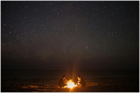 A couple enjoying a bonfire on a serene beach under a starlit sky, perfect for night photography themes.
