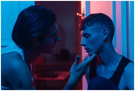 Intimate portrait of two men sharing a moment in atmospheric colored lighting.