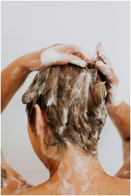 Close-up of a woman washing hair with foam shampoo, focused on hygiene and care.