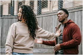 A couple in casual clothing appears to be in a disagreement outdoors with grey fencing background.