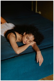 Thoughtful woman with curly hair lying on bed, exp
