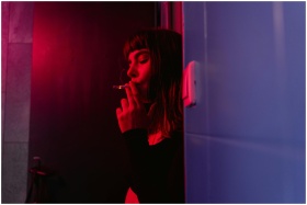 Moody indoor photo of a woman smoking in a nightclub with red lighting.