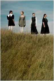 Four women in simple dresses standing on a grassy hill under a blue sky.