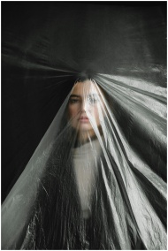 A striking portrait of a woman obscured by plastic
