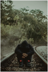 A person in a hoodie sits on empty train tracks, s
