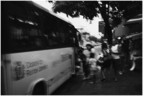 Blurred black and white photo of people boarding a bus in Rio de Janeiro.