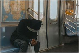 A lone passenger sitting in a New York City subway train, evokes feelings of solitude and reflection.