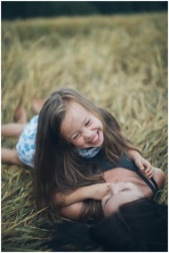 A joyful mother and daughter sharing a playful moment in a sunlit summer field.