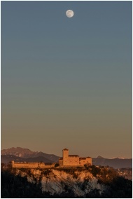 A majestic castle on a hilltop under a full moon against a mountainous backdrop during dusk, creating a serene atmosphere.