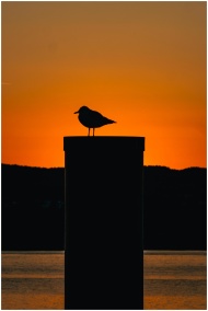 Silhouette of a seagull perched against a vivid su