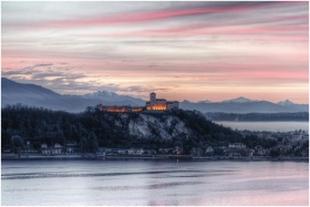 Captivating twilight view of Rocca di Angera with serene lake and mountain backdrop.