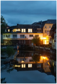 Warmly lit riverside buildings reflecting in water at twilight, creating a serene evening scene.