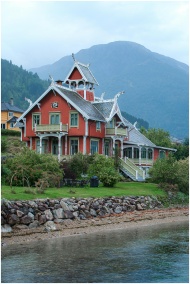 Picturesque wooden house by the fjord in Balestrand, Norway, surrounded by mountains.