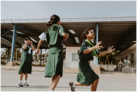 Three girls joyfully playing outside wearing schoo