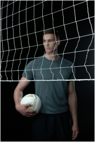 Focus on a male volleyball player standing behind a net holding a volleyball in a studio.