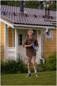 Teenage boy enjoying a game of frisbee in a lush countryside garden.