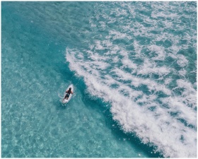 Surfer rides the crystal-clear waves of Waikiki beach in Honolulu, Hawaii.