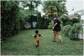 Father and son bonding over a game of football in their lush green garden, enjoying fun family time.
