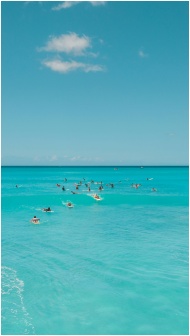 A vibrant scene of surfers enjoying the ocean under a clear blue sky, perfect for summer activities.