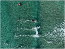 High-angle shot capturing surfers on vibrant ocean waves, perfect for outdoor and adventure themes.