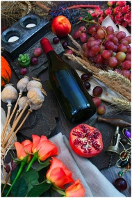 Colorful arrangement of wine, fruits, and flowers in a rustic setting.