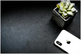 Elegant flatlay of a smartphone and succulent on a dark background with ample copyspace.