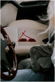 Close-up of stylish red sunglasses on a car seat, suggesting a casual road trip vibe.
