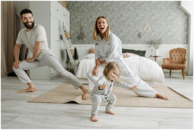 A joyful family engaging in morning stretches together, fostering a fun and healthy routine.
