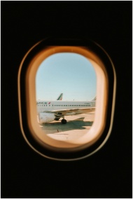 Airplane captured through a window seat during takeoff, showcasing travel vibes and runway.