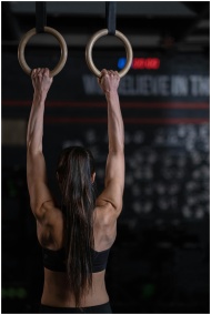 Back view of a woman exercising on gymnastic rings