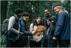 Diverse group of friends hiking together, planning
