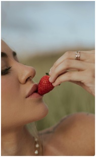 Close-up of a woman gently biting into a fresh strawberry, set outdoors.