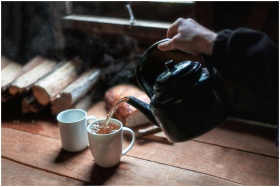 Rustic scene of hot tea being poured from a teapot