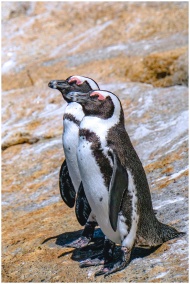 Close-up of two African penguins standing on rocks in Cape Town, South Africa.