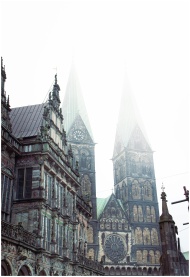 A mystical view of Bremen Cathedral's gothic towers emerging through the fog in winter.