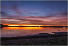 Vibrant sunset over a serene lake, reflecting vivid hues of orange and blue.