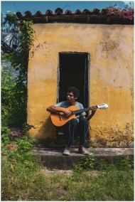 A man playing guitar outside a rustic yellow house in Brazil on a sunny day.