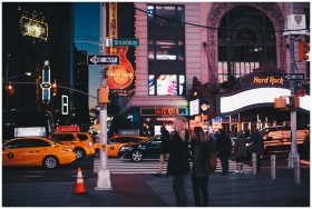 A bustling street view of Broadway at night featuring Hard Rock Cafe, taxis, and pedestrians in New York City.