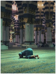 A person praying inside the historic Al-Masjid an-Nabawi, Medina, Saudi Arabia.