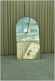 A stylish mirror reflects a sunlit interior with curtains and modern architecture.