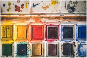 A colorful close-up of a used watercolor paint palette with vibrant hues.