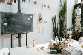 A classroom setup with a blackboard, skeleton model, and classroom supplies.