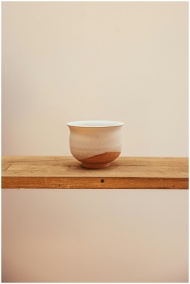 A simple ceramic bowl placed on a wooden shelf wit