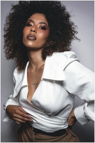 Elegant woman with curly hair in white blouse posing indoors, exuding confidence.