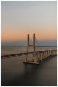 Breathtaking view of Vasco da Gama Bridge over calm waters at sunset, Lisbon, Portugal.