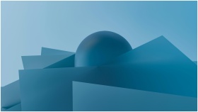 A modern abstract 3D render with blue geometric shapes and a sphere.